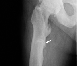 44 ans : pseudo-fracture sous-trochantérienne droite incomplète le long de la région médiale du cortex.